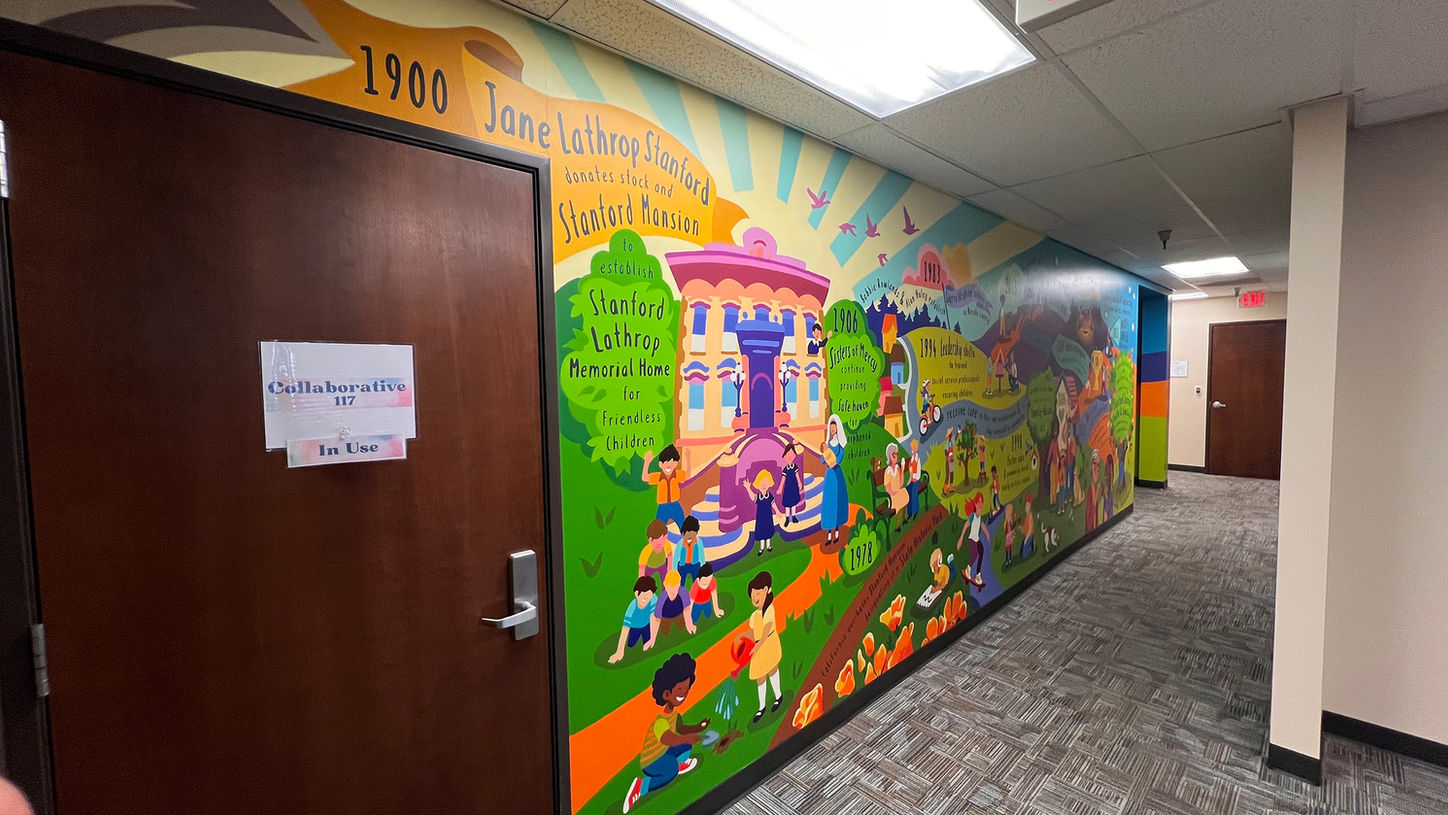 Home and Heart in Bloom celebrates 125 years of Stanford Sierra Youth & Families, tracing its journey from early beginnings to the lasting legacy it continues to build today. Seeds of hope take root along multicolored pathways, marking moments of growth, support, and connection. Inspired by milestones and real stories, the mural reflects the many ways healing, belonging, and permanency can take shape. Showcasing compassion and being human with other humans, this imagery is meant to uplift, to welcome, and to remind us that we walk this path together.